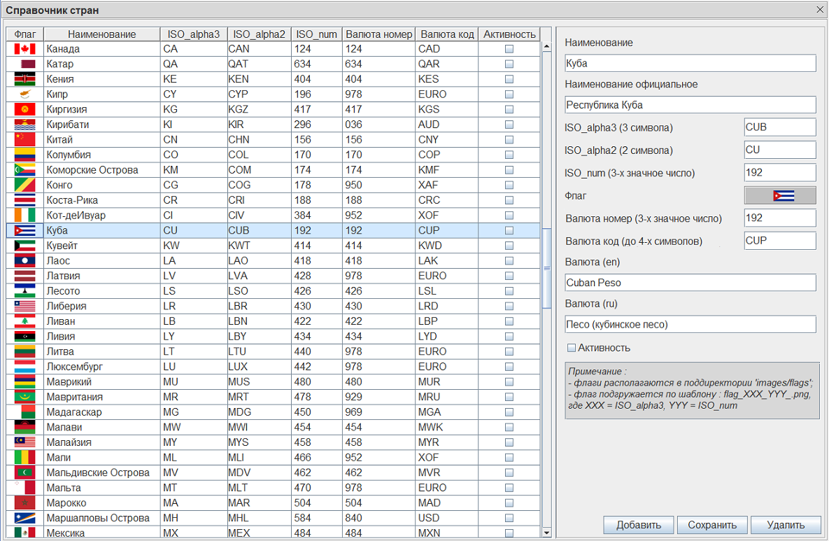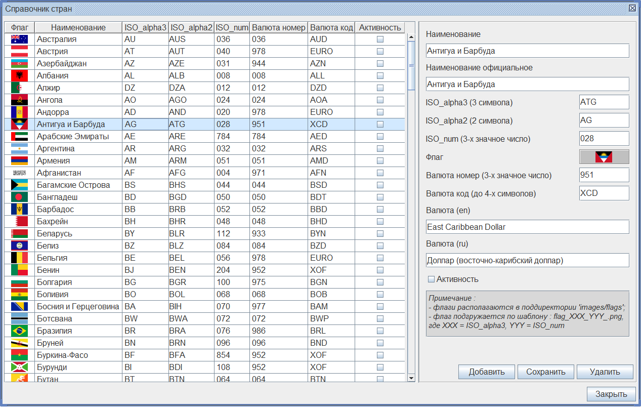 Интерфейсные настройкиРегулируемые настройки интерфейса, связанные с размером диалогового окна, положением сепаратора между таблицей и панелью компонентов, а также размеры колонок таблицы сохраняются и при очередном старте восстанавливаются. Поля записиНаименование и Наименование официальное ISO_alpha3, ISO_alpha2, ISO_num, Валюта номер, Валюта код Флаг Активность Локализация интерфейса и данныхИнтерфейсная форма, предупреждающие сообщения и данные справочника стран локализованы. Модуль list-countries подписан на рассылку сообщения по смене текущего языка локализации jabricks/LocaleEvent. Изменение в приложении JaBricks текущего объекта локализации Locale автоматически переведет интерфейс справочника и данные на новый язык локализации без перезагрузки. Локализованные ресурсы интерфейса модуля включены в бандл. Значение текущего языка локализации модуль получает в утилите управления внешними ресурсами util-resources. Модуль включает три языка локализации : русский, английский, немецкий. Справочная таблица БДЗаписи справочника хранятся в базе данных (БД) в таблице jbt_countries. Для установлени связи с сервером БД list-countries использует модуль util-db, позволяющего взаимодействовать с несколькими разнотипными SQL-серверами. Модуль list-countries включает методы создания таблицы и инициализации справочных записей. При первом (после инсталляции в приложение) старте модуля в БД создается таблица jbt_countries, в таблицу записываются инсталляционные справочные данные. При последующем использовании справочника стран выполняется только проверка наличия таблицы jbt_countries в соответствующей структуре БД. Инсталляционные справочные записи стран модуль загружает в БД из внешнего файла data.init/list_countries.txt.